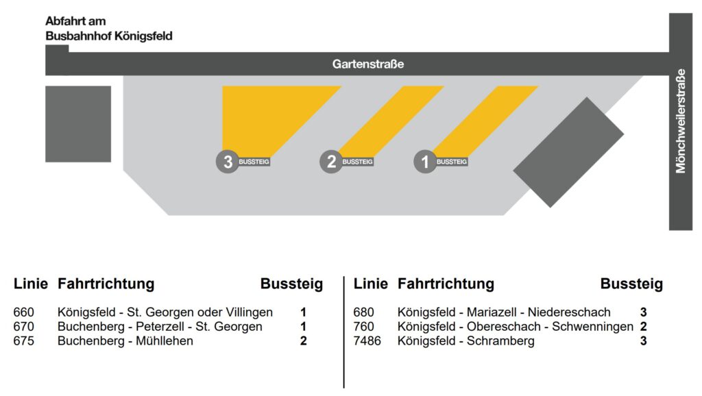 Auf Steig 1 am Wartehäuschen fahren die Linien 660 nach Villingen und St. Georgen sowie die Linie 670 nach St. Georgen ab. Busse der Linie 670 sollen nach dem Busbahnhof zur Haltestelle Grund- und Hauptschule fahren und dort bis zur Abfahrt warten.