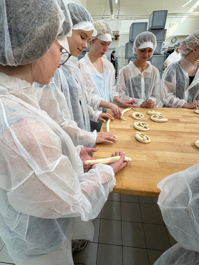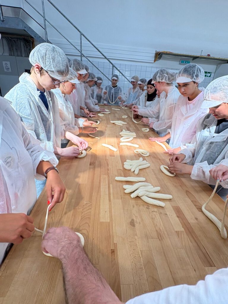 Ein besonderes Highlight des Besuchs war der praktische Teil: Unter fachkundiger Anleitung durften wir selbst Brezeln herstellen. Nach einer kurzen Demonstration konnten wir das Teigrollen und Brezelformen ausprobieren – was deutlich schwieriger war, als es zunächst aussah! Dennoch hatten alle viel Spaß, und am Ende entstanden viele individuelle (und teilweise kreative) Brezelformen.