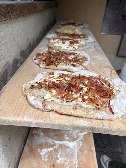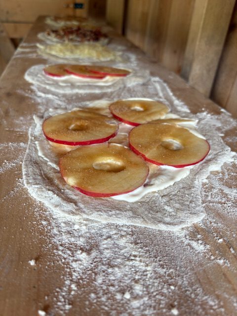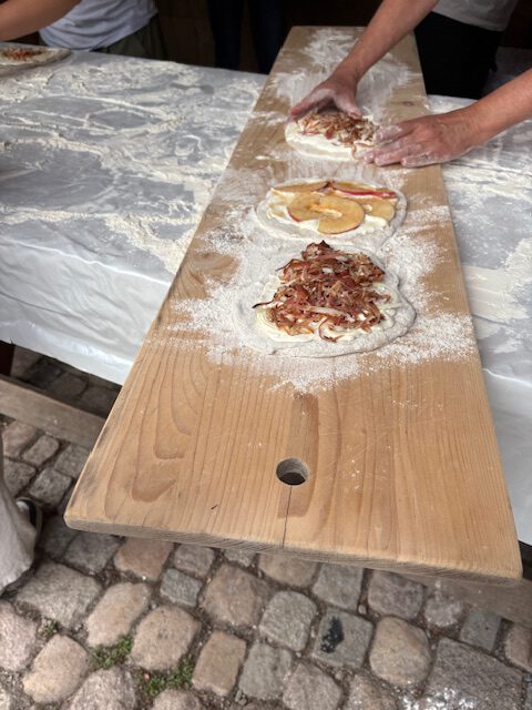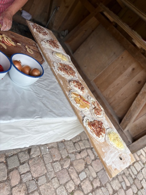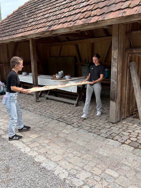 Im praktischen Teil durften die Schülerinnen und Schüler selbst Hand anlegen. Unter fachkundiger Anleitung bereiteten sie aus Hefeteigfladen zu. Diese wurden mit viel Engagement belegt und nach kurzer Ruhezeit im Ofen gebacken. Der Duft des frischen Gebäcks lockte schnell alle an den Tisch – und die anschließende Verköstigung war ein voller Erfolg.