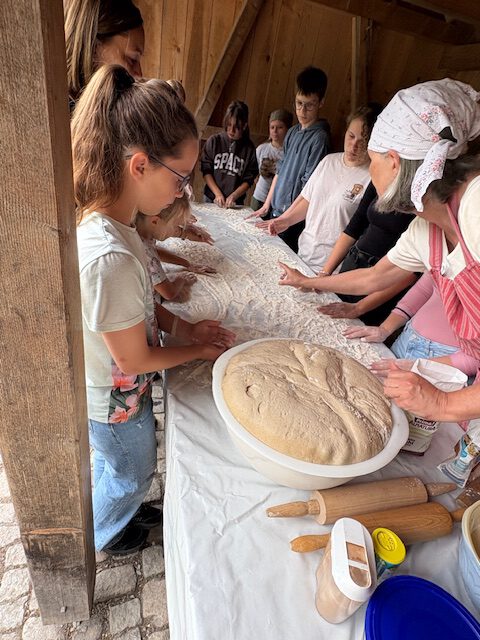 Ein Schwerpunkt des Tages lag auf dem Thema Getreideanbau und -verarbeitung. Die Gruppe lernte, wie mühsam die Ernte von Hand war, welche Geräte dabei zum Einsatz kamen und welche Rolle das Wetter spielte. Im Anschluss führte der Weg zur alten Mühle, in der eindrucksvoll demonstriert wurde, wie aus dem geernteten Korn Mehl gewonnen wurde – ganz ohne Elektrizität, nur mit der Kraft des Wassers.