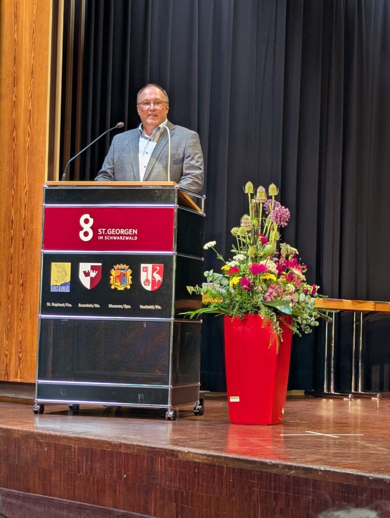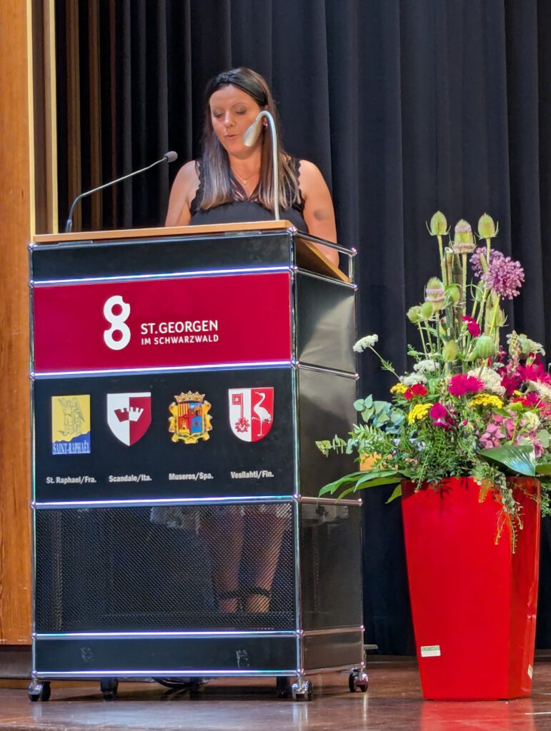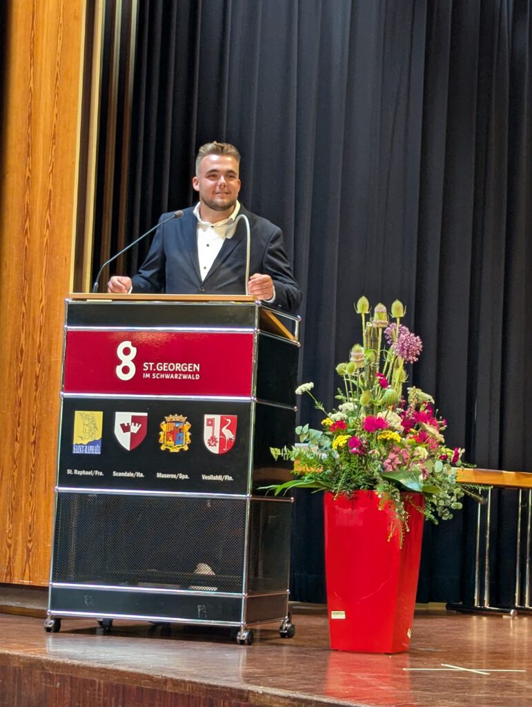 Die Feier begann um 16 Uhr in der Stadthalle in St. Georgen, die festlich geschmückt und mit ca. 500 Gästen voll besetzt war. Unter den Gästen waren stolze Eltern, Geschwister und Freunde, sowie das Kollegium, ehemalige Lehrkräfte und Schulleitungsmitglieder anderer St. Georgener Schulen. Als Vertreterin des Schulträgers überreichte Hedwig König den Sozialpreis der Stadt St. Georgen. Dieser ging an Mateusz Byrtek, der sich außergewöhnlich innerhalb und außerhalb der Schulgemeinschaft engagierte. Musikalisch umrahmt wurde die Veranstaltung von der Rock-AG unter der Leitung von Herrn T. Buschmann, die mit ihren Darbietungen für eine feierliche Atmosphäre sorgte. Für das leibliche Wohl sorgte die Klassenstufe 9 unter der Klassenleitung von Herr Gronert, Herr Hass und Herr Klaußner.