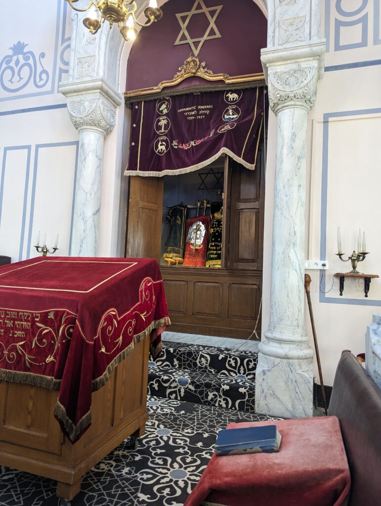Wir haben uns an der Schule getroffen und uns dort in zwei Gruppen aufgeteilt. Anschließend sind wir mit zwei Bussen losgefahren. Wir fuhren ungefähr 2 Stunden bis unsere Wege sich trennten, zur Synagoge und zum Jüdischen Friedhof. In der Synagoge haben wir eine Führung von Herrn Geissmann bekommen. Er hat uns über den jüdischen Glauben und dessen Bräuche aufgeklärt. Außerdem hat er uns das jüdische alte Testament gezeigt, die Thora und uns auch etwas aus der Thora auf Hebräisch vorgelesen. Danach sind wir in ein damaliges Jüdisches Ghetto gegangen und haben einen kleinen Stadtrundgang durch Obernai gemacht. Er zeigte uns die alte Synagoge die leider nicht mehr so vorhanden ist und das sogenannte alte Judengässle. Er erzählte uns auch, dass die Namen seiner Großeltern auf Stolpersteinen festgehalten wurden, da sie den Holocaust nicht überlebten wie viele weitere Mitglieder seiner Familie. In einer kurzen Mittagspause durften wir uns anschließend ein wenig den Ort besichtigen und französische Spezialitäten probieren.