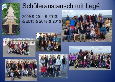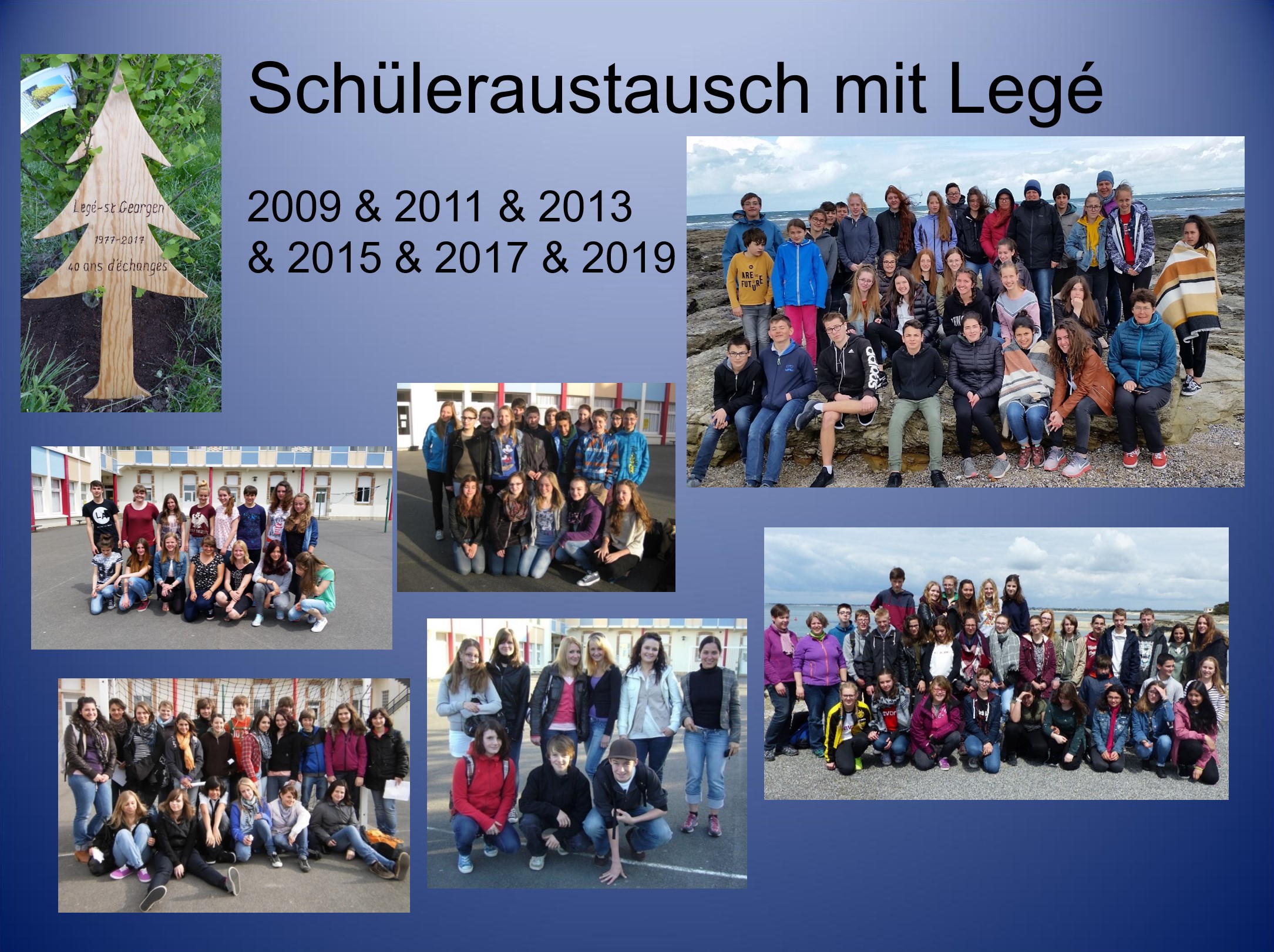 Seit über 40 Jahren besteht die Schulpartnerschaft mit dem Collège Sainte-Anne in Legé bei Nantes. Alle zwei Jahre besuchen die Französisch-Schüler aus unseren 8. und 9. Klassen ihre Partner in Legé. Im Gegenbesuch kommen die französischen Gäste auch nach St. Georgen. Der Schüleraustausch bietet die einzigartige Gelegenheit, den Alltag einer französischen Gastfamilie mitzuerleben, die Unterschiede und Gemeinsamkeiten zu entdecken und seine Sprachkenntnisse anzuwenden und zu verbessern. In den 9 Tagen machen wir immer zahlreiche Ausflüge, lernen den Schulalltag kennen und nehmen viele neue Eindrücke mit nach Hause. Der Schüleraustausch ergänzt unser abwechslungsreiches landeskundliches Angebot an Ausflügen und Tagesexkursionen nach Frankreich.