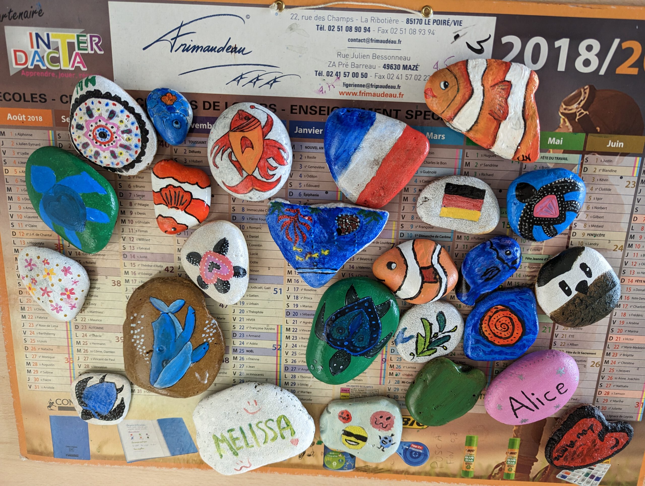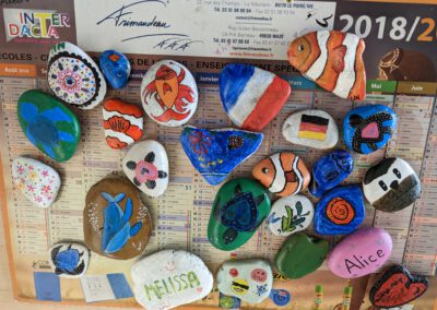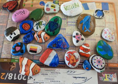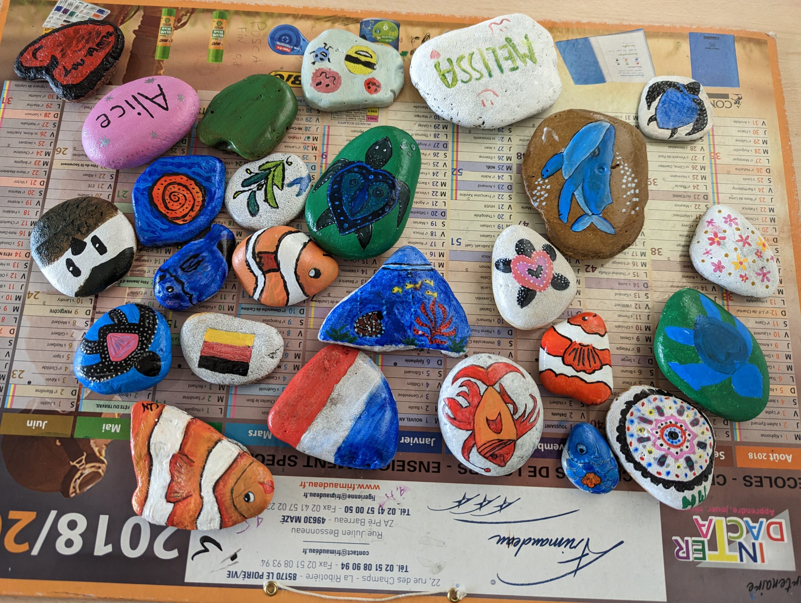 Am Montag hat die Schule um 8:00 Uhr begonnen. Da die Franzosen Unterricht hatten, haben wir im Deutschraum mit Madame Carole und Frau Rohland Steine bemalt.