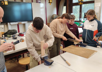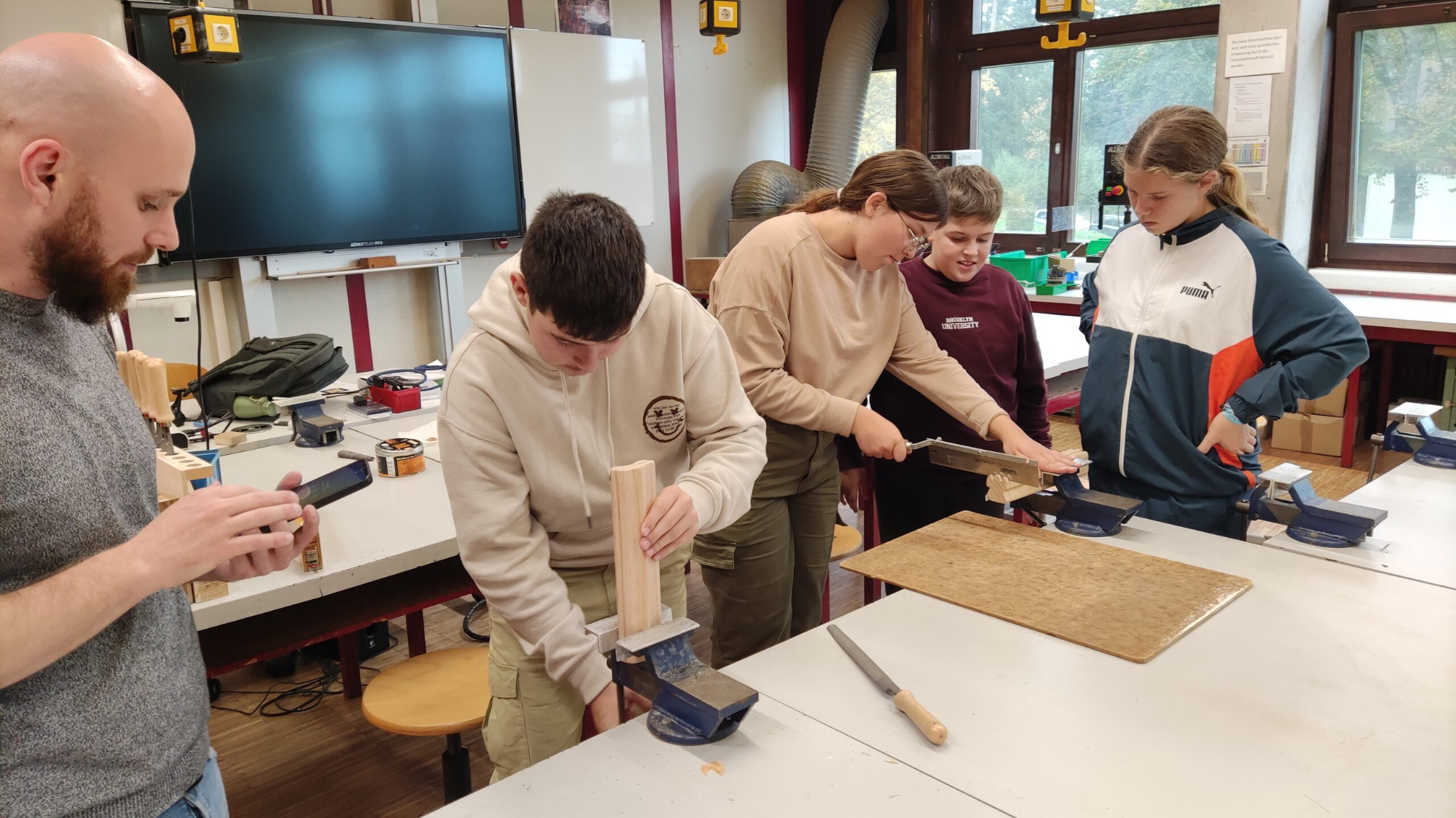 Am Mittwochvormittag wurden zunächst deutsche Gesellschaftsspiele mit der neunten Französischklasse und Frau Hochstein ausprobiert. Den unbekannten Technikraum durften die Franzosen unter Leitung von Herrn Linsler bei einem Holzworkshop entdecken. Fleißige Helfer aus der 8d unterstützten die Gruppe. Jeder Schüler ging mit einem selbstgemachten Schlüsselanhänger nach Hause. Der Nachmittag war zur freien Verfügung in den Familien.