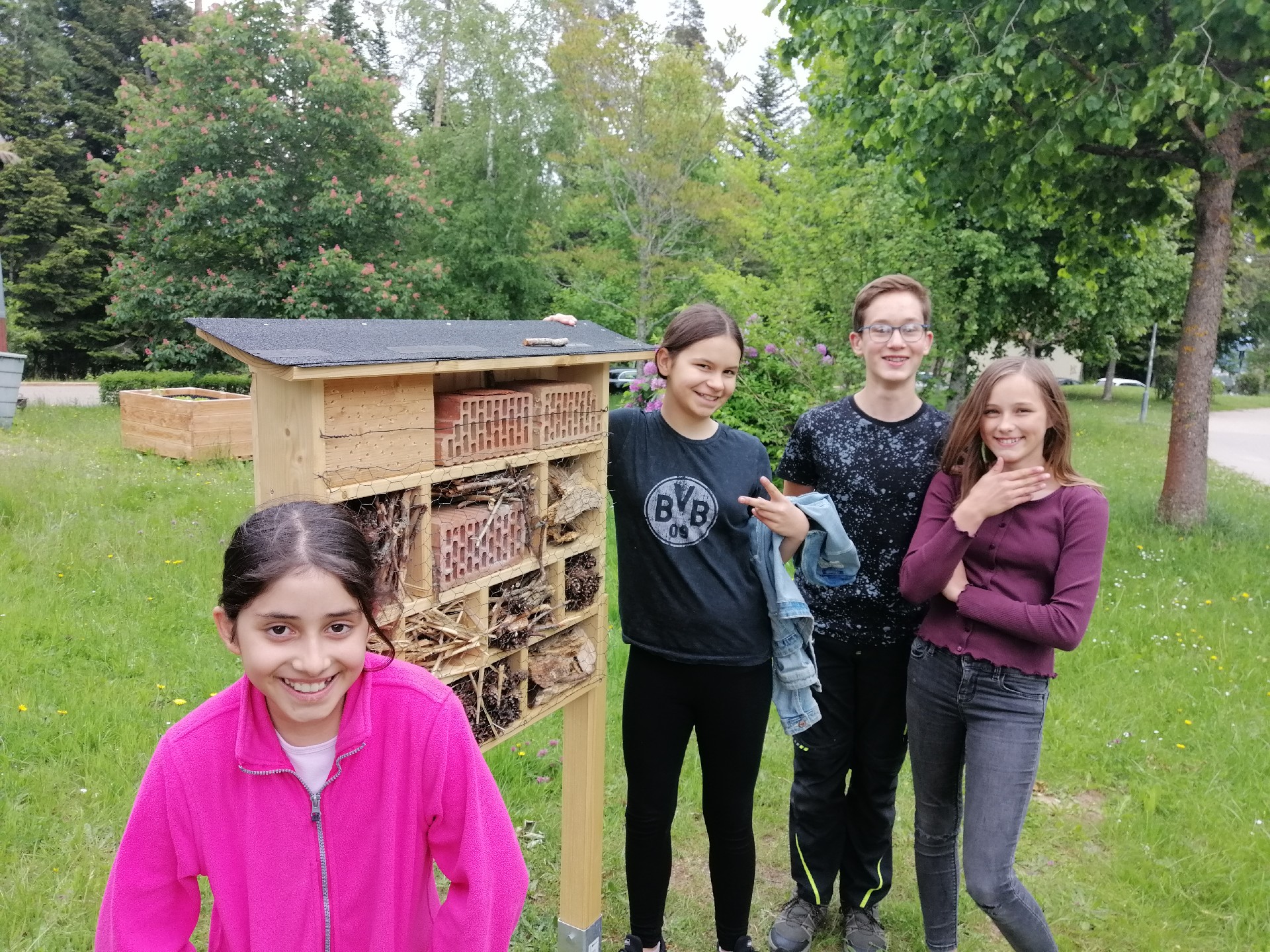 Hi, in diesem Text erzähle ich euch, wie die Garten-AG das Insektenhotel aufgestellt hat. Dafür haben wir zuerst ein Loch gegraben. Anschließend haben wir die Pfosten mit einem großen Hammer in die Erde geschlagen. Danach haben wir das Insektenhotel an die Pfosten geschraubt. Jetzt steht das Insektenhotel!