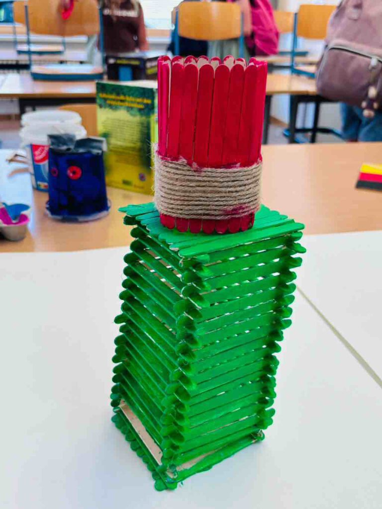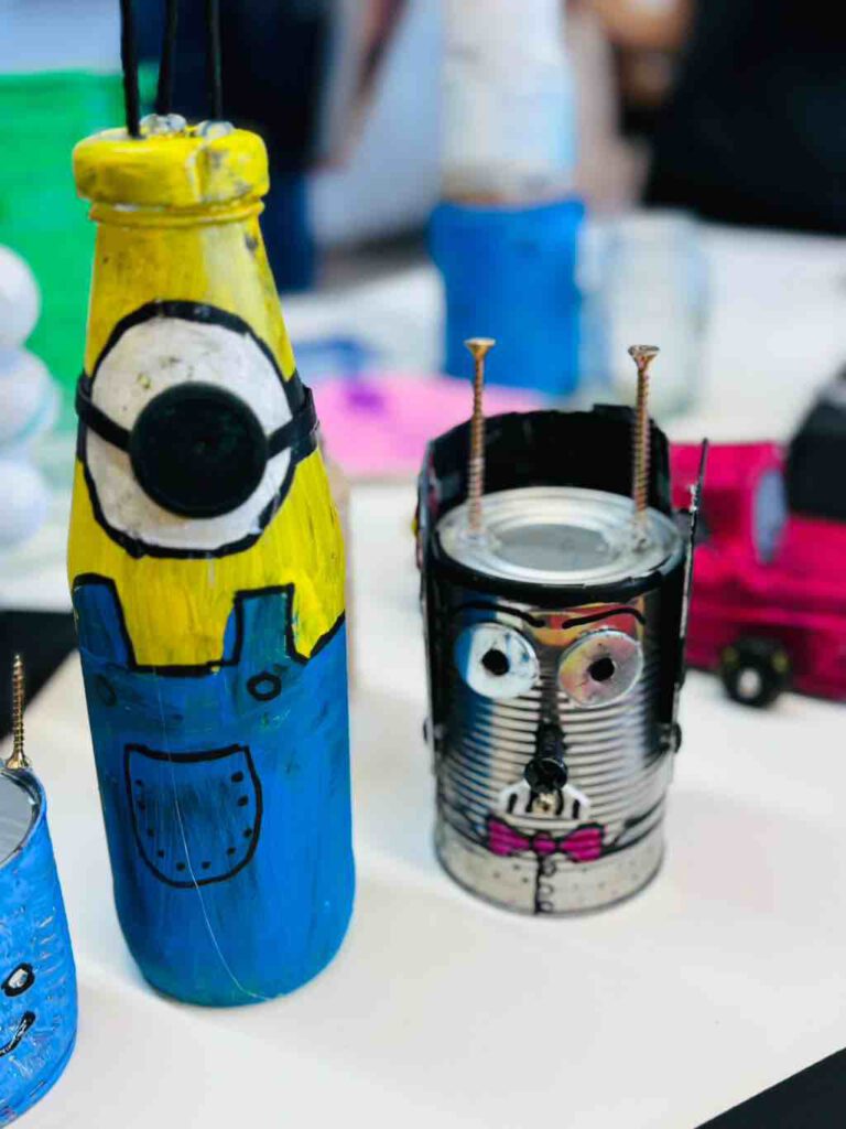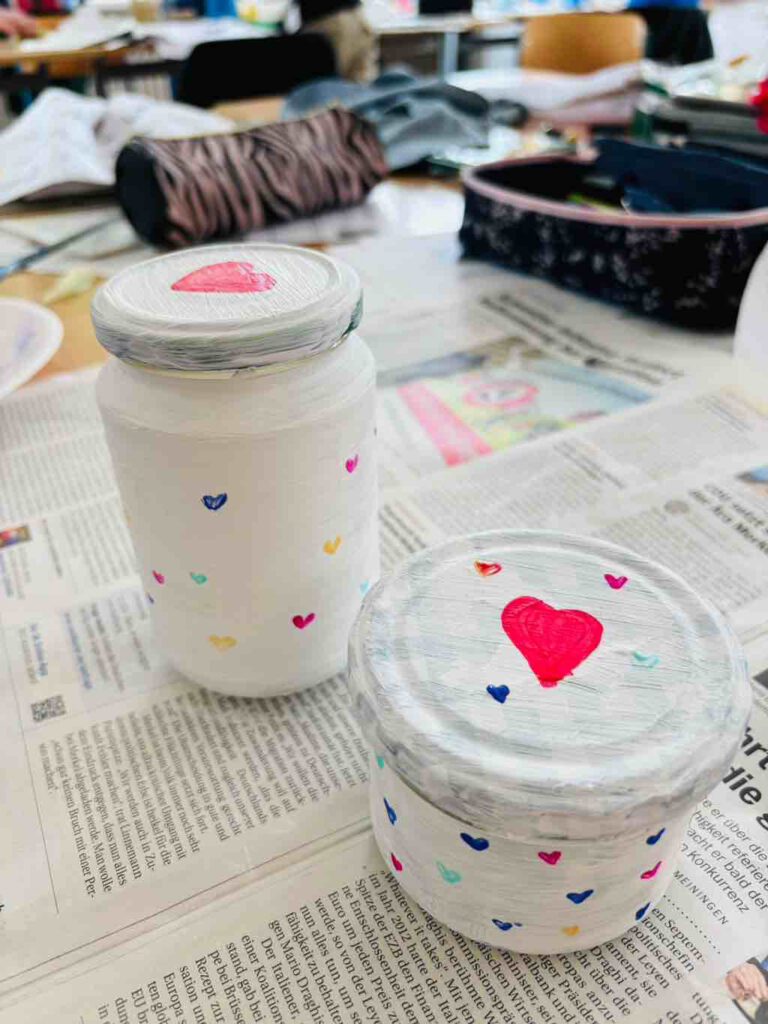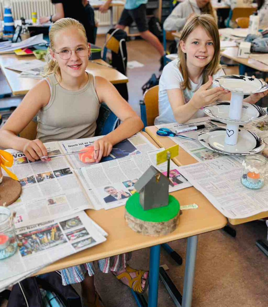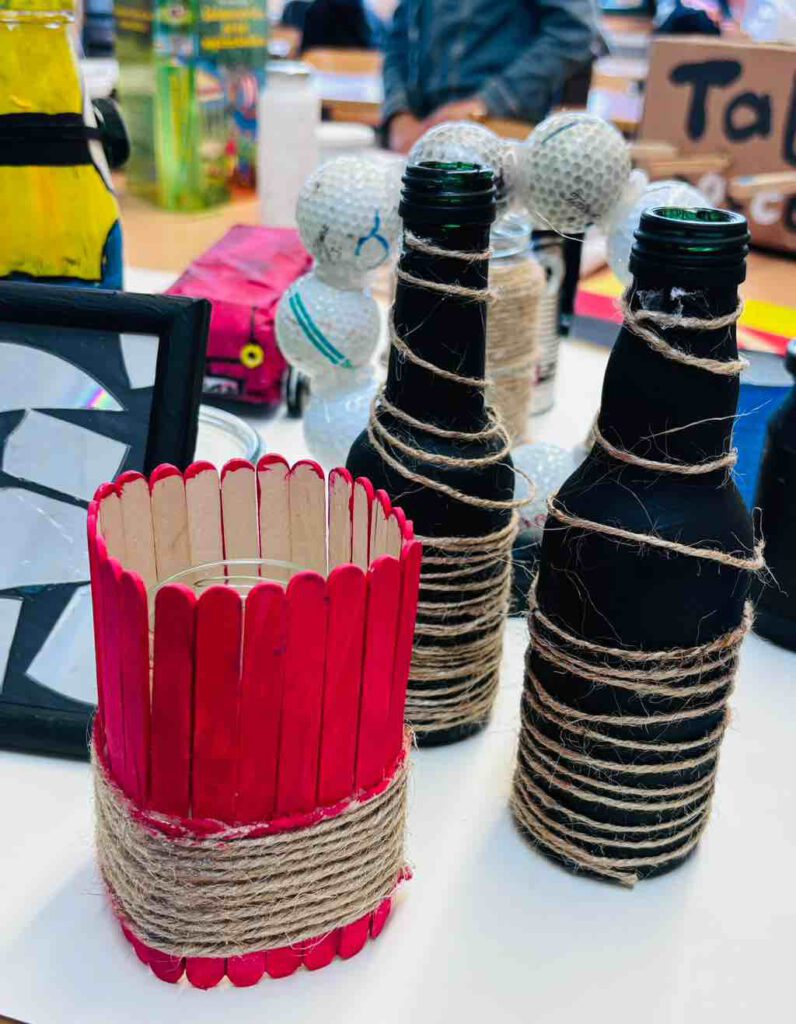 In der zweiten Projektwoche vom 15.-19.07. wurde für die Klassenstufe 6 unter Anderem das Projekt „Upcycling“ angeboten. Wir haben aus alten Dosen, Gläsern, Tellern, Tetrapacks usw. viele schöne Dinge gestaltet, wie zum Beispiel Vasen, Türme, Spiele, Fensterschmuck, weitere Dekoobjekte und Vogelfutterhäuschen.