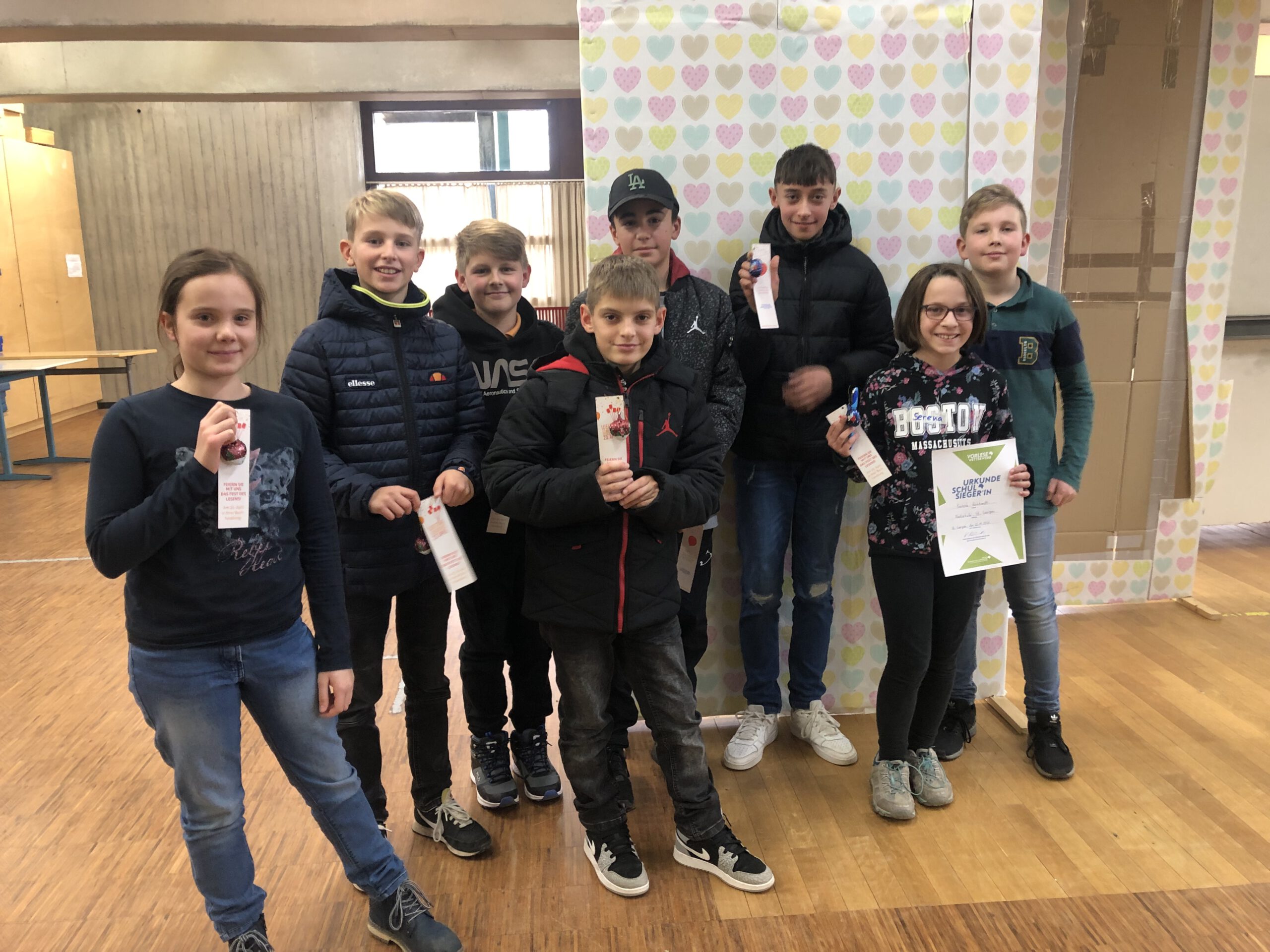 Innerhalb der Projektwoche der Realschule St. Georgen fand am Dienstag, den 22.11.2022, der Schulentscheid des Vorlesewettbewerbs des Deutschen Buchhandels statt. Vor einer Jury aus Schülerinnen der zehnten Klassen und Lehrern lasen die Klassensieger aus den sechsten Klassen einen geübten Text sowie einen Fremdtext vor. Alle Schülerinnen und Schüler absolvierten dies auf hohem Niveau, so dass die Leistungen im oberen Bereich sehr nahe beieinander lagen. Dennoch konnte sich mit der höchsten Punktzahl Serena Reinhardt (zweite von rechts) aus der Klasse 6c von der Konkurrenz absetzen. Sie darf als Schulsiegerin beim Regionalentscheid des Schwarzwald-Baar-Kreises für die Realschule St. Georgen ins Rennen gehen.