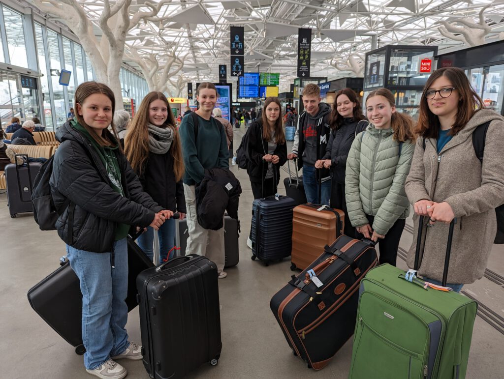 Der Tag begann für uns schon um halb 4. Wir trafen uns um 5 Uhr morgens am Schulparkplatz. Der Bus wartete dort schon auf uns. Mit dem Bus sind wir zuerst zwei Stunden direkt nach Straßburg gefahren. Dort angekommen, hatten wir eine halbe Stunde Freizeit. Der nächste Stop mit dem TGV war Nantes. Durch die Streiks hatten wir Bedenken dass der Zug pünktlich in Nantes eintrifft. In Nantes angekommen, wurden wir von den französischen Lehrern herzlich begrüßt. Danach sind wir mit einem kleinem Bus nach Legé zur Schule Saintes-Anne gefahren. Anschliessend wurden wir von unseren Austauschpartnern herzlich willkommen geheissen. Nach ein paar Spielen wurden wir in die Familien geschickt.