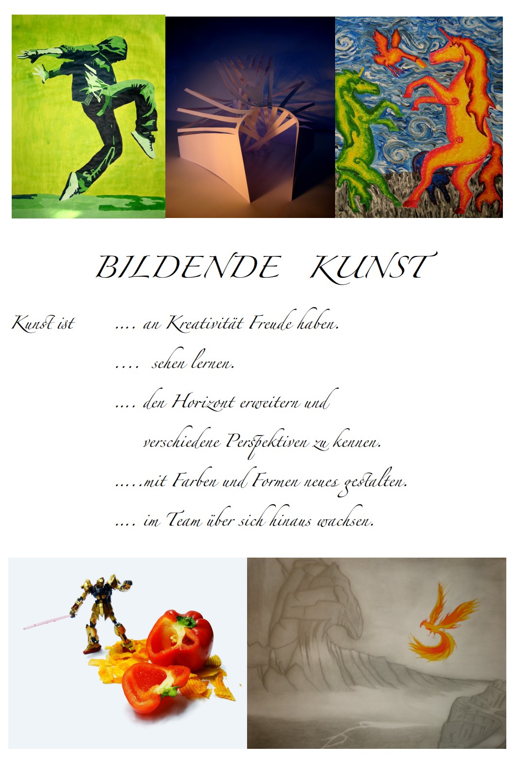Das Fach Bk fördert umfassend schöpferische Kräfte und ästhetische Sensibilität. Kognitive, bildnerische und emotionale Fähigkeiten werden gefördert und gefordert und leisten dadurch einen wichtigen Beitrag zur Identität des jungen Menschen. Das übergeordnete Ziel der Bildkompetenz des Einzelnen wird in den inhaltsbezogenen Kompetenzen Fläche (Grafik, Malerei), Raum (Plastik, Architektur) und Zeit (Medien, Aktion) geschult.