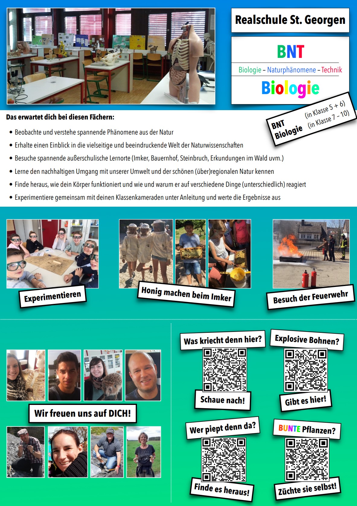 Das Fach BNT (Biologie-Naturphänomene und Technik) hast du in Klasse 5 und 6 jeweils 4 Stunden pro Woche. Hier darfst du spannende Phänomene aus der Natur und Technik kennenlernen.