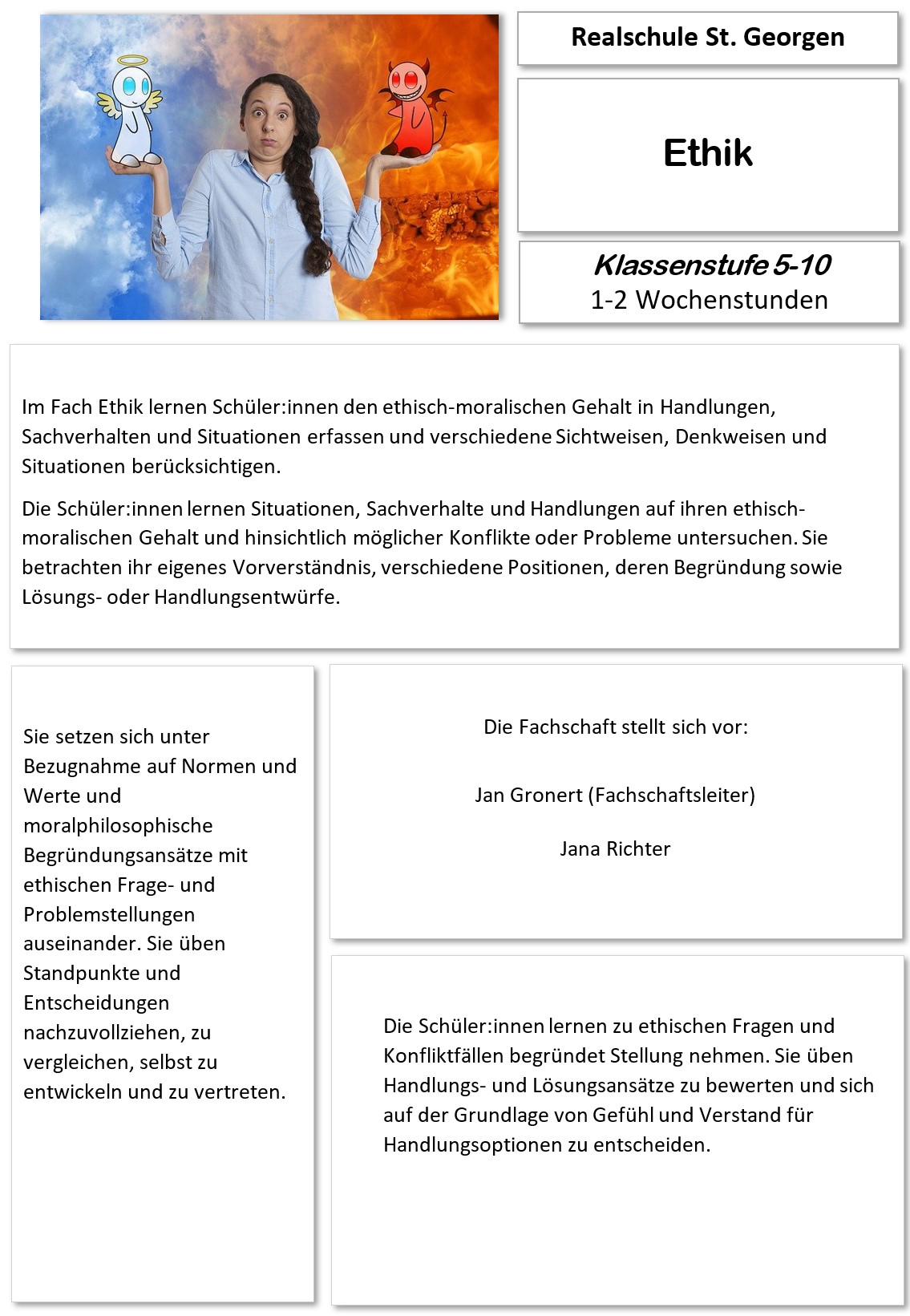Das Fach Ethik kann dir eine Orientierungshilfe bei Fragen und Problemen geben, die sich dir in deinem privaten, familiären und schulischen Umfeld ergeben. Dabei will es deine Suche nach eigenen Lebenszielen und dem damit verbundenen Zurechtfinden in unserer Gesellschaft unterstützen. Unterrichtet wird das Fach in den Klassen 5 bis 8 einstündig, in 9 und 10 zweistündig.