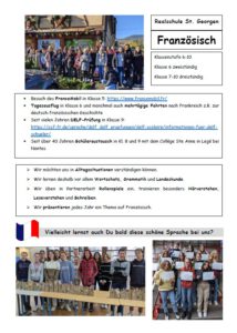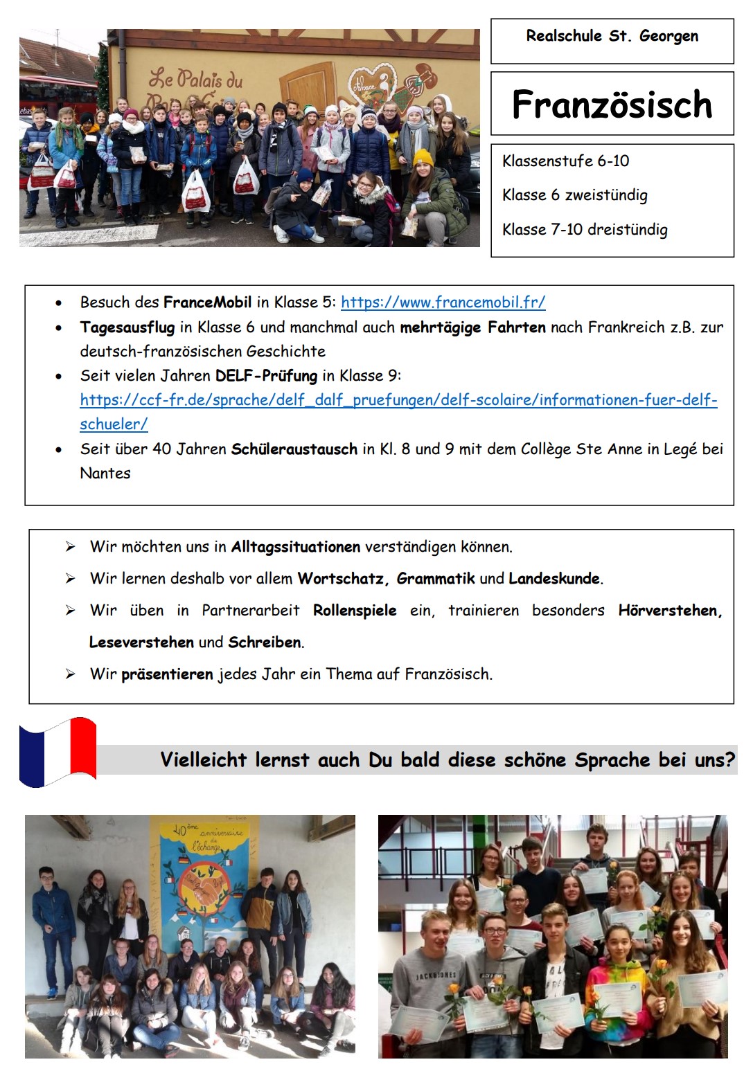 Im Fach Französisch lernst du die Sprache unseres Nachbarn Frankreich. Wir üben, uns in Alltagssituationen in der Fremdsprache zu verständigen. Neben Grammatik und Vokabeln lernen wir auch das Land in ein-und mehrtägigen Ausflügen besser kennen oder besuchen unsere Partnerschule in Legé im Rahmen des Schüleraustausches. Wir freuen uns auf möglichst viele neue interessierte Französisch-Lernende!