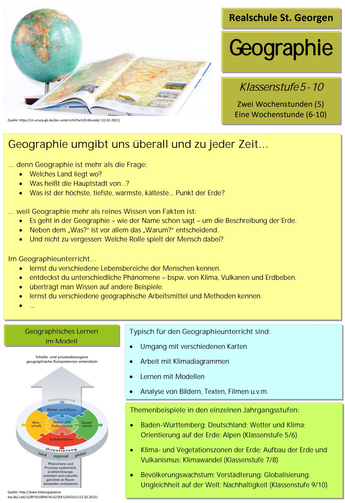 In Klasse 5 wird Geographie zweistündig unterrichtet, in den Klassen 6 bis 10 jeweils eine Stunde.