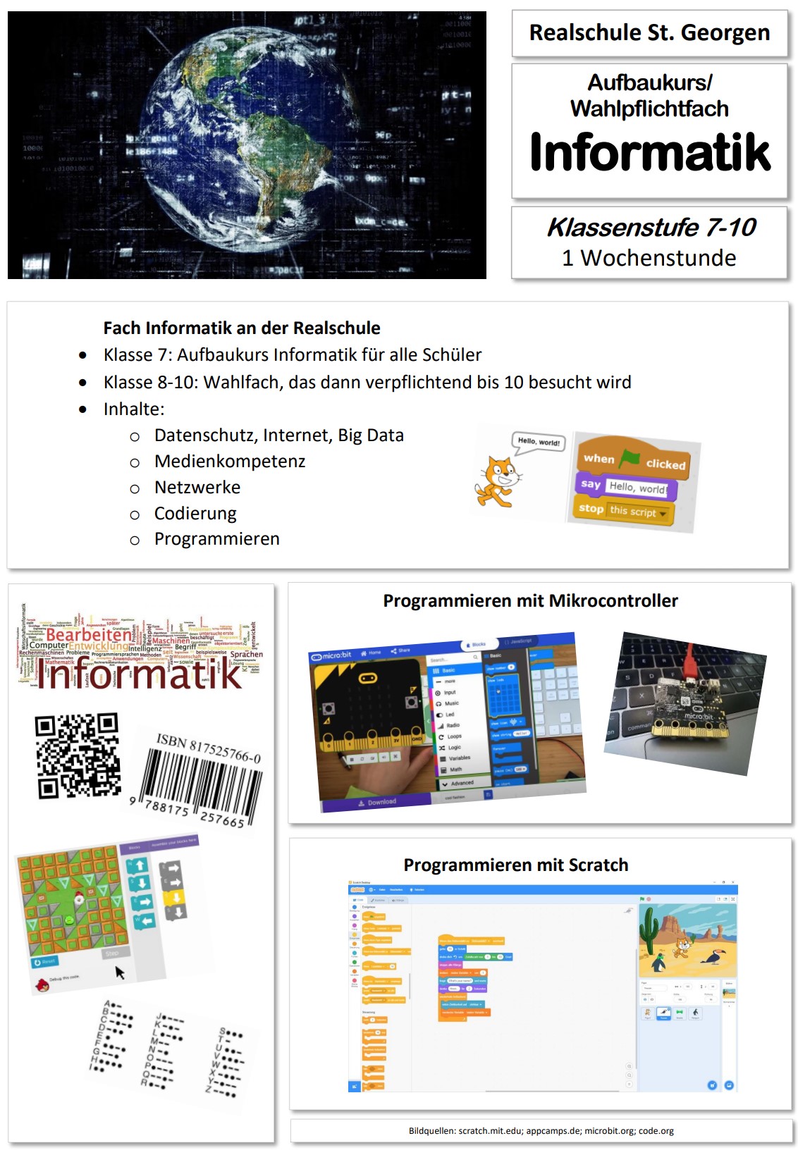 Im Fach Informatik lernst du die Welt der Computer und des Programmierens in unserem Alltag kennen. In Klasse 7 muss jeder Schüler das Fach als Aufbaukurs Informatik besuchen. Am Ende von Klasse 7 entscheidest du dich freiwillig, ob du das Fach als Wahlpflichtfach Informatik bis Klasse 10 besuchen möchtest. Das Fach muss dann bis zum Ende von Klasse 10 besucht werden. Die Inhalte des Unterrichts bereiten dich auf die (informationstechnische) Arbeits- und Lebenswelt und den weiteren Bildungsweg nach der Realschule vor.