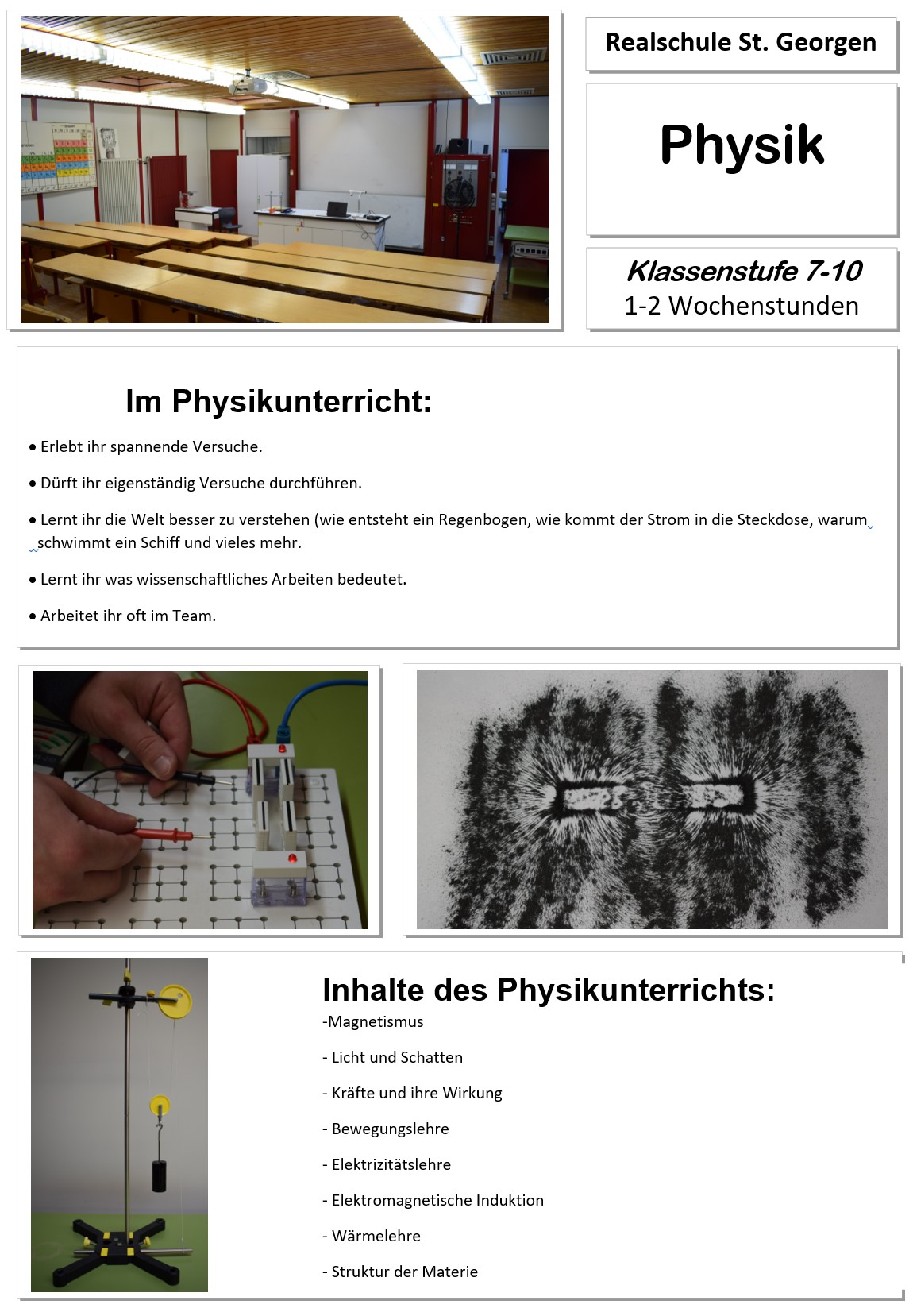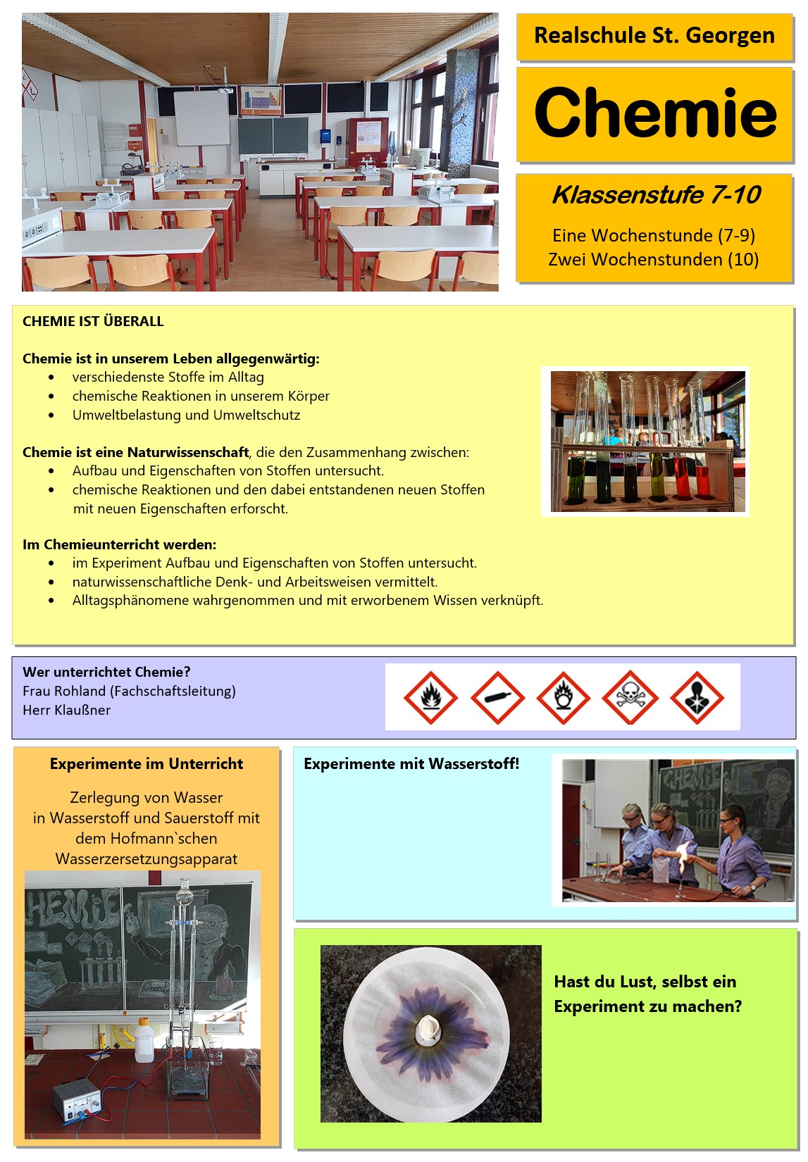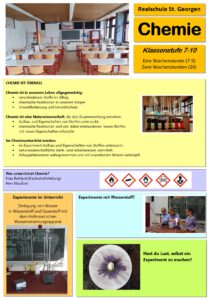 Das Fach Chemie wird in den Klassen 7 bis 9 jeweils eine Stunde pro Woche unterrichtet. In Klasse 10 zwei Stunden pro Woche.