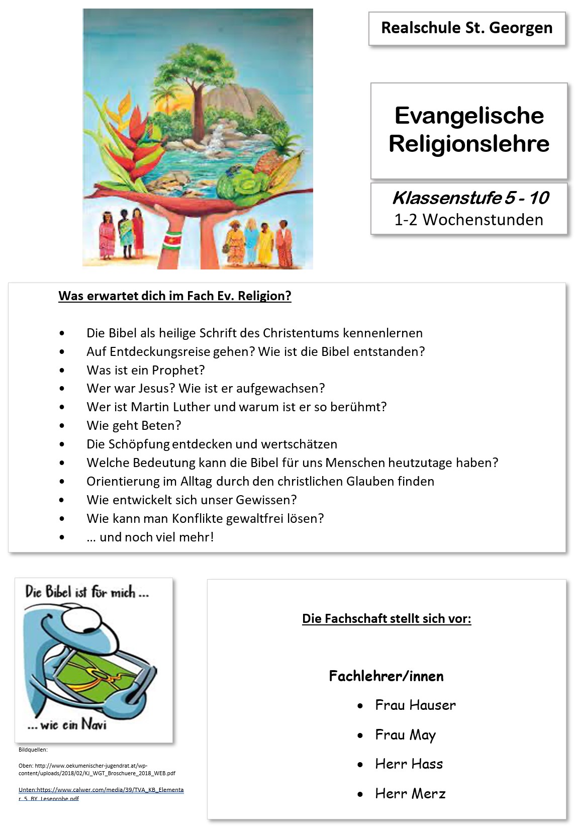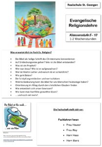Im Fach Evangelische Religionslehre lernst du den Umgang mit der Bibel und die Personen, von der die Bibel handelt, kennen. Es geht um das Leben Jesu, wie das Christentum verbreitet wurde, wie die Evangelische Kirche entstanden ist und was Ökumene bedeutet, aber auch der Umgang mit Gewalt und die Bildung eines eigenen Gewissens spielen eine große Rolle. Evangelische Religion wird zweistündig, nur in Klasse 8 einstündig, unterrichtet.