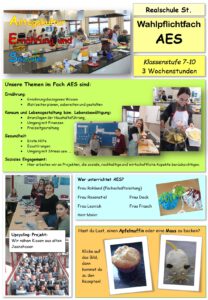 Im Fach AES beschäftigst du dich mit verschiedenen Themen aus dem Alltag wie z.B. Ernährung, Gesundheit, Konsum, Lebensbewältungung und Lebensgestaltung. Das Besondere an unserem Fach ist, dass wir auch praktisch arbeiten. So breiten wir in unserer Schulküche Mahlzeiten zu und nähen im Textilraum.