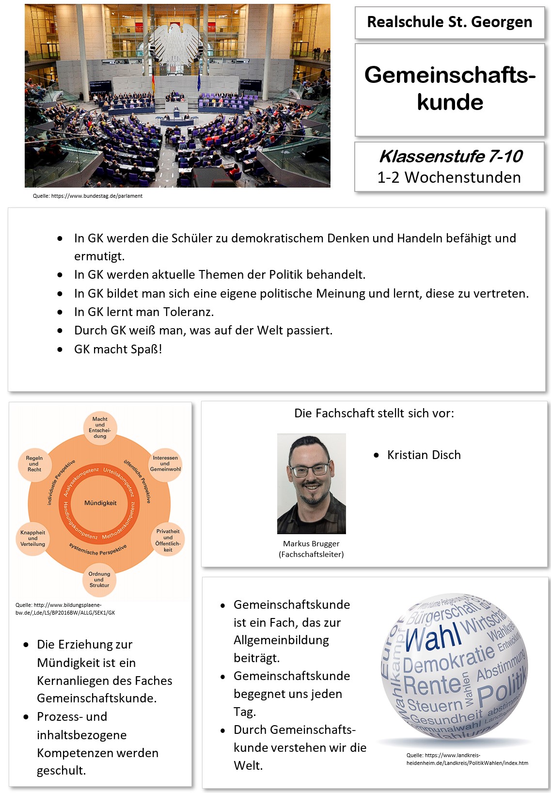 Im Fach Gemeinschaftskunde lernst du aktuelle Themen und Personen der Politik kennen. Es geht beispielsweise um „Kinderrechte in Deutschland und der Welt“, „Demokratie in der Gemeinde“, „Friedenssicherung“ und um das „Projekt Europa“. In Klasse 7 wird GK zweistündig unterrichtet, in den Klassen 8 bis 10 jeweils eine Stunde.