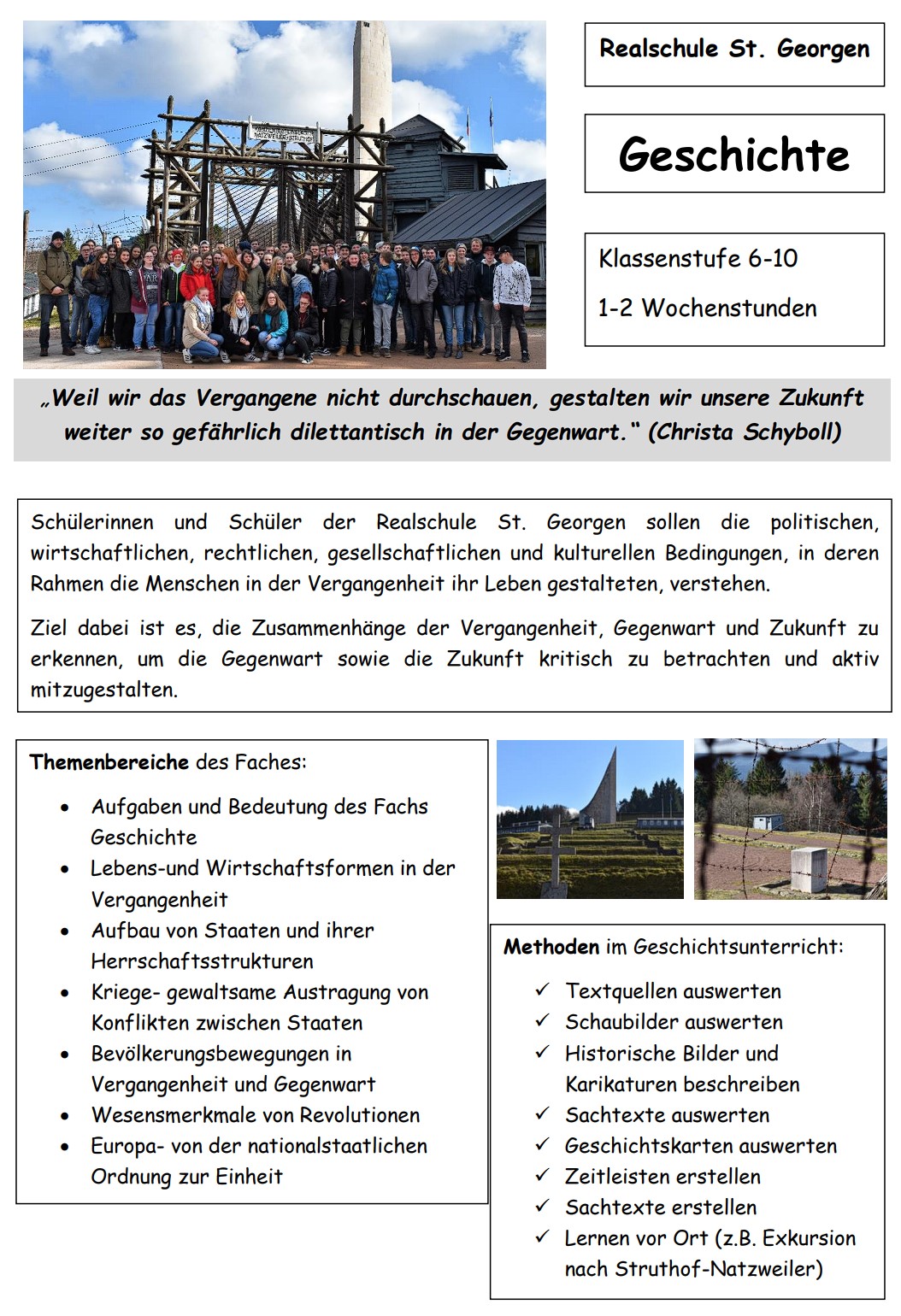 Im Fach Geschichte lernst du, die politischen, wirtschaftlichen, rechtlichen, gesellschaftlichen und kulturellen Bedingungen, in deren Rahmen die Menschen in der Vergangenheit ihr Leben gestalteten, zu verstehen. Ziel dabei ist es, dass du die Zusammenhänge der Vergangenheit, Gegenwart und Zukunft erkennst, um die Gegenwart sowie die Zukunft kritisch betrachten und aktiv mitgestalten zu können. Die Themenbereiche sind unter anderem „Antike“, „Mittelalter“ und „Neuzeit“. In den Klassenstufen 6, 7 und 9 ist das Fach zweistündig, in den Klassen 8 und 10 jeweils einstündig.