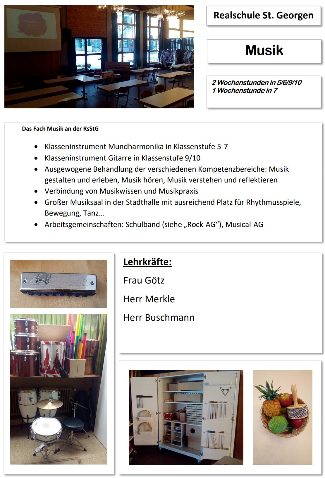 Das Fach Musik wird an der Realschule St. Georgen zweistündig in den Klassenstufen 5, 6, 9, 10 sowie einstündig in der Klassenstufe 7 unterrichtet. Der Musikunterricht findet im Musiksaal in der Stadthalle statt. Neben dem praktischen Musizieren (Erlernen eines Klasseninstruments, Singen…) spielen auch Themen, wie z.B. Instrumentenkunde und Notenlehre eine wichtige Rolle.