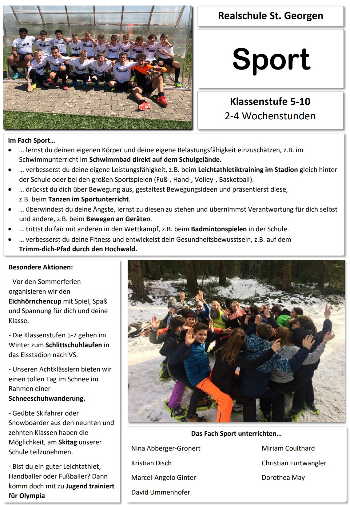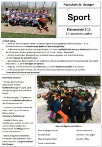 Im Fach Sport lernst du deinen eigenen Körper und deine Belastungsfähigkeit einzuschätzen. Du verbesserst auch deine Fitness oder drückst dich über Bewegung aus, gestaltest Bewegungsideen und präsentierst diese. Du überwindest deine Ängste, lernst zu diesen zu stehen und übernimmst Verantwortung für dich selbst und andere. Bei vielen Gelegenheiten trittst du fair mit anderen in den Wettkampf. Spiel, Spaß und Spannung bieten zudem verschiedene Sporttage, an welchen du im Laufe deiner Schulzeit teilnimmst.