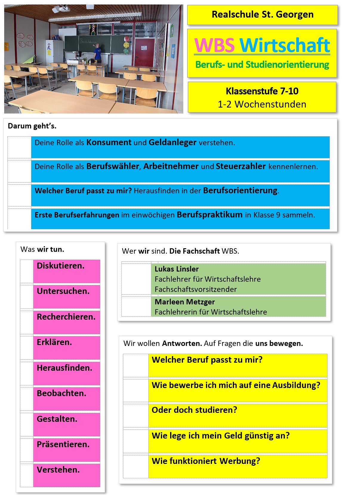 Im Fach Wirtschaft, Berufs- und Studienorientierung – kurz WBS – lernst du aktuelle Themen und Personen der Wirtschaft kennen. Es geht beispielsweise um Fragen der eigenen Haushaltsführung und Finanzierung, um Aspekte deiner Berufswahl, aber auch um wichtiges Grundlagenwissen der Wirtschaftswissenschaft. Hier lernst du wie sich Preise auf den Märkten bilden und welche Rechte du als Käufer von Waren und Dienstleistungen hast. In Klasse 9 kannst du durch ein Berufspraktikum erste praktische Einblicke in die Arbeitswelt erhalten. WBS wird ab Klasse 7 bis Klasse 10 ein- bis zweistündig die Woche besucht.