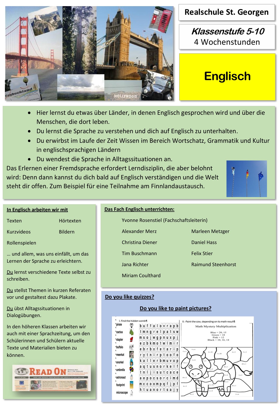 Englisch ist an der Realschule die Pflichfremdsprache. Ihr setzt euch sich in dem Fach mit sprachlicher und kultureller Vielfalt auseinander und lernt andere Kulturen kennen. Ihr lernt euch in der Fremdsprache sicher auszudrücken und lernt landeskundliche Besonderheiten englischsprachiger Länder kennen. Die Fremdsprache eröffnet euch weitere Perspektiven in eurem beruflichen Werdegang.