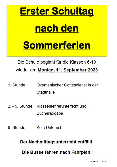 Eine Übersicht zum ersten Schultag ist angefügt. In der Pausenhalle wird eine Stellwand mit weiteren Informationen stehen. Neue Schülerinnen und Schüler finden sich zu Beginn der zweiten Stunde (8:30 Uhr) vor dem Sekretariat ein.